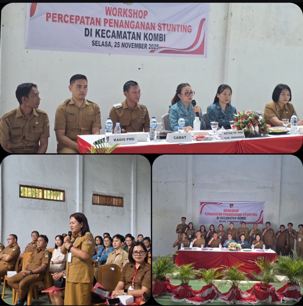 Wulansulutnews.com- Ketua TP-PKK Kabupaten Minahasa, Ny. Martina W. Dondokambey-Lengkong, SE., menghadiri sekaligus membawakan materi pada Workshop Percepatan Penanganan Stunting yang dilaksanakan di Kecamatan Kombi. Selasa (25/11/2025).