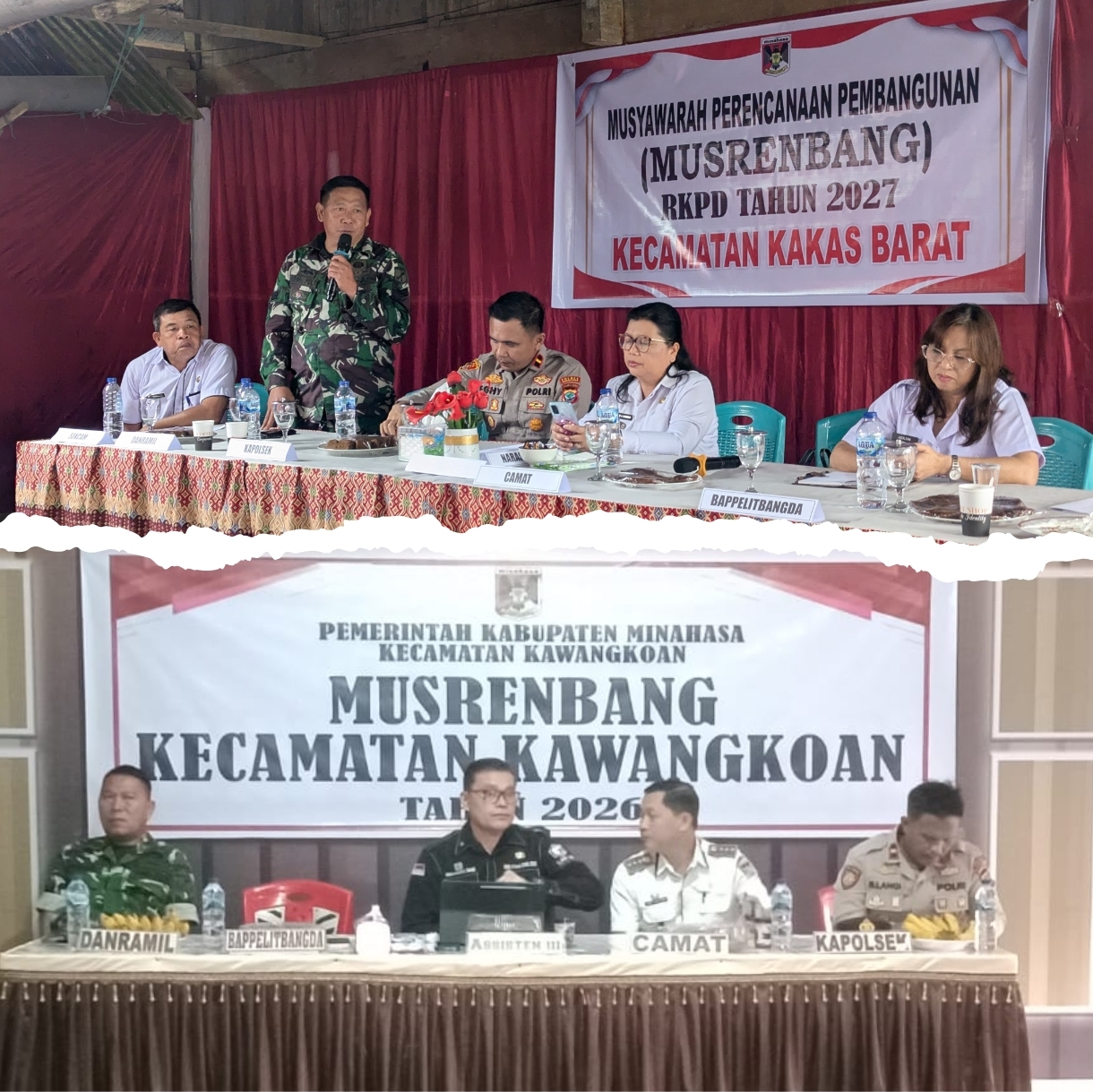 Sementara itu, di Kecamatan Kawangkoan, Babinsa Koramil 1302-08/Kawangkoan Serka Viko Lumolos turut menghadiri Musrenbang RKPD yang dilaksanakan di ruang rapat Kantor Kecamatan. Forum ini dihadiri Asisten III Kabupaten Minahasa, unsur Bapelitbangda, Camat Kawangkoan, TNI-Polri, kapuskesmas, serta para lurah dan Hukum Tua.